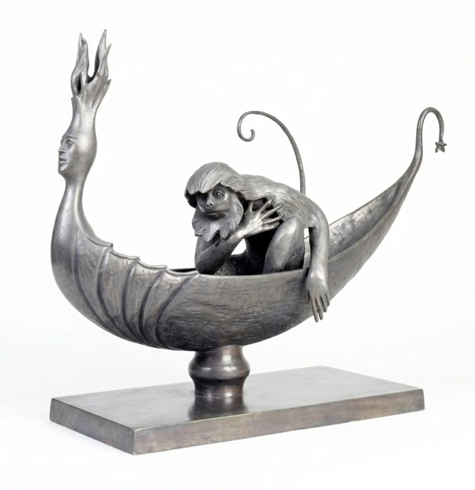La escultura «Canoa con chango» condensa la mitología personal de Leonora Carrington, presentando a un simio en una embarcación cuya proa termina en un rostro humano coronado por llamas. El mono (chango en el español de México), con una expresión de curiosidad o asombro, es el pasajero de un vehículo místico.